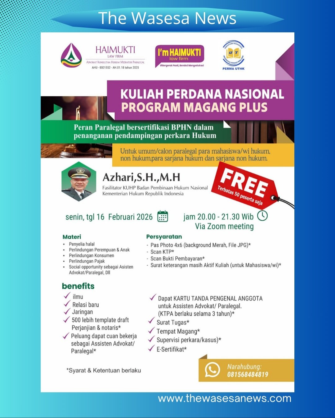 Haimukti Law Firm mengundang Anda—mahasiswa, sarjana hukum, hingga masyarakat umum—untuk bergabung dalam Kuliah Perdana Nasional: Program Magang Plus. Kami percaya bahwa kesadaran hukum adalah kunci kesejahteraan sosial, dan Anda bisa menjadi jembatan tersebut.
