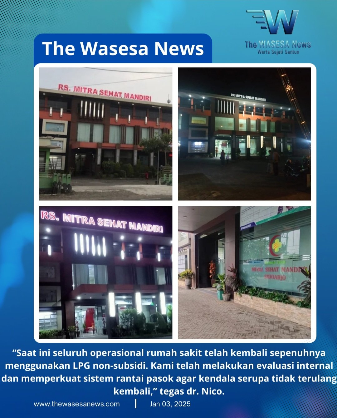 “Kami tidak memiliki kesengajaan menggunakan LPG subsidi untuk tujuan profit. RS Mitra Sehat Mandiri selalu menjalankan pelayanan sesuai SOP. Penggunaan tersebut bersifat sementara karena stok LPG non-subsidi kosong saat kejadian, dan langsung kami ganti kembali ke LPG pink di hari yang sama setelah pasokan tersedia,” ujar dr. Dwiky, Jumat (2/1/2026).