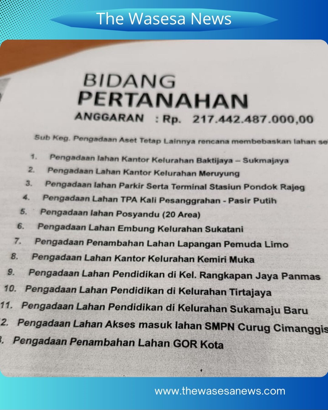 Berdasarkan penelusuran GPKN, lokasi pengadaan lahan dalam perencanaan awal seharusnya berada di Kelurahan Sukamaju Baru dengan luas ±4.000 meter persegi. Namun dalam pelaksanaannya, lahan yang dibebaskan justru berada di Kelurahan Jatijajar dengan luas sekitar 3.000 meter persegi.