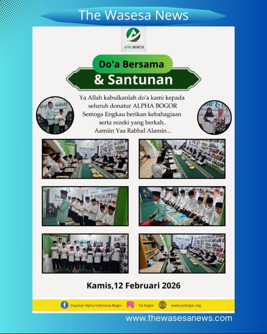Alhamdulillah, puji syukur kita panjatkan ke hadirat Allah SWT. Atas izin dan inayah-Nya, agenda rutin kolaborasi antara Media The Wasesa News bersama Yayasan Alpha Indonesia Bogor (YAI Bogor) dalam tajuk Dzikir, Do’a Bersama, dan Santunan Pekanan pada Kamis, 12 Februari 2026 telah berjalan dengan khidmat dan penuh keberkahan.
